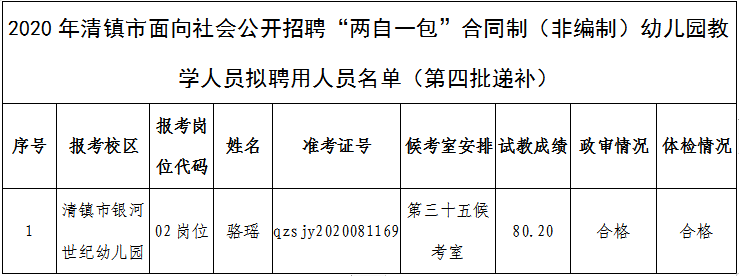 根據(jù)《清鎮(zhèn)市面向社會公開招聘“兩自一包”合同制(非編制)幼兒園教學人員公告》相關程序,現(xiàn)將第四批遞補(共1名)考核政審合格擬聘用人員予以公示。