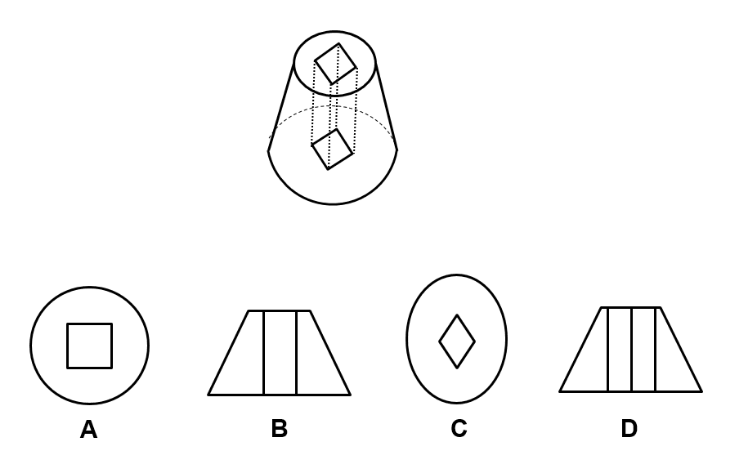 55.左邊的立體圖形是從正圓臺(tái)中間垂直向下挖出一個(gè)橫截面為正方形的長(zhǎng)方體后形成的,將該立方體圖形從任意面剖開,下列哪一項(xiàng)不可能是從垂直于剖面看的視圖( )