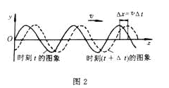 波的圖象表示介質(zhì)中各質(zhì)點(diǎn)在某一時(shí)刻(同一時(shí)刻)偏離平衡位置的位移的空間分布情況。在不同時(shí)刻質(zhì)點(diǎn)振動(dòng)的位移不同,波形也隨之改變,不同時(shí)刻的波形曲線是不同的。圖2表示經(jīng)過(guò)叢時(shí)間后的波的形狀和各質(zhì)點(diǎn)的位移。