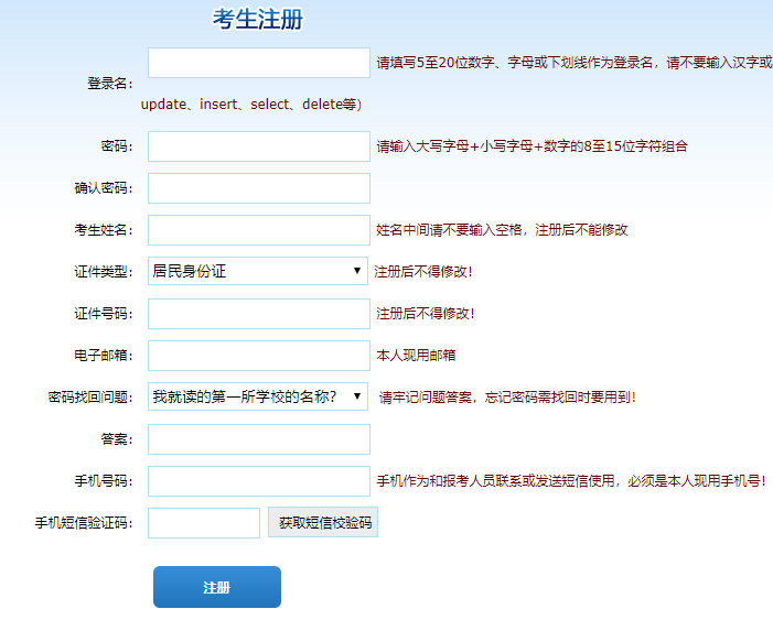 提示:報(bào)名前注冊(cè)的考生可以直接填寫登錄報(bào)名,沒有注冊(cè)的考生需要先進(jìn)行注冊(cè)在登錄報(bào)名。點(diǎn)擊注冊(cè)按鈕,進(jìn)入注冊(cè)頁(yè)面。