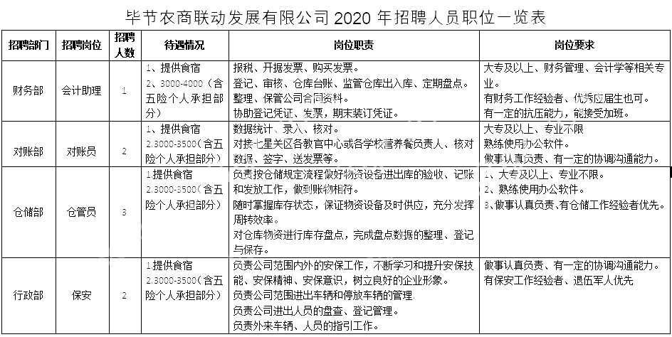 附件1:畢節(jié)農(nóng)商聯(lián)動發(fā)展有限公司2020年招聘職位表