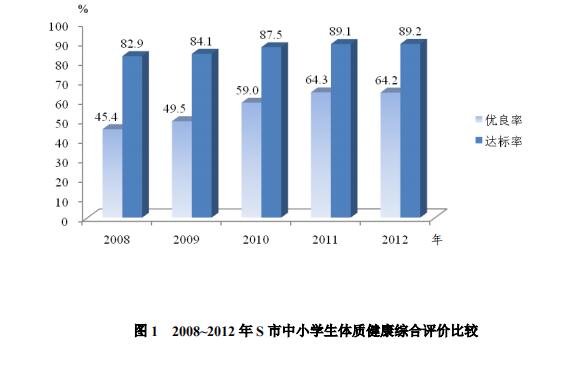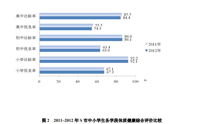 統(tǒng)計(jì)結(jié)果顯示:2012 年,S 市中小學(xué)生體質(zhì)健康綜合評(píng)價(jià)達(dá)標(biāo)率(達(dá)到體質(zhì)健康綜合評(píng)價(jià)?及格?以上標(biāo)準(zhǔn)的人數(shù)比例)為 89.2%,優(yōu)良率(達(dá)到體質(zhì)健康綜合評(píng)價(jià)?優(yōu)秀?和?良好?標(biāo)準(zhǔn)的人數(shù)比例)為 64.2%。