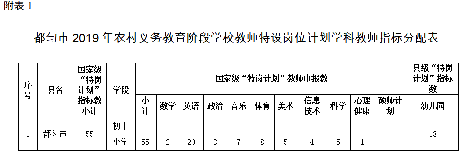 1. 都勻市2019年農(nóng)村義務(wù)教育階段學(xué)校教師特設(shè)崗位計(jì)劃學(xué)科教師指標(biāo)分配表