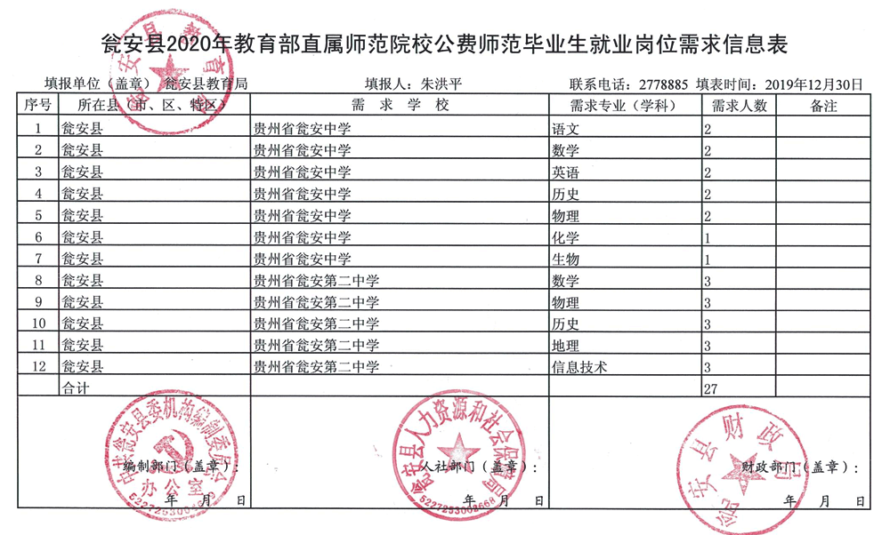 為加強(qiáng)甕安縣教師人才隊(duì)伍建設(shè),優(yōu)化人才結(jié)構(gòu),根據(jù)《教育部直屬師范大學(xué)師范生公費(fèi)教育實(shí)施辦法》(國(guó)發(fā)〔2018〕75號(hào))文件精神,結(jié)合我縣高級(jí)中學(xué)空崗和人才需求情況,經(jīng)甕安縣人民政府同意兩所高中(貴州省甕安中學(xué)、貴州省甕安第二中學(xué))引進(jìn)部屬師范大學(xué)公費(fèi)師范畢業(yè)生,充實(shí)高中教師隊(duì)伍,特制定此招聘簡(jiǎn)章。