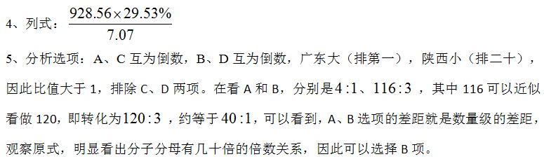 根據(jù)最近幾年的考試,資料分析有一些弱化計算,強(qiáng)調(diào)數(shù)據(jù)分析的趨勢,所以在我們平時的備考過程中大家也要重視這方面的練習(xí)。在我們列式后,首先不要著急算,而是要觀察分析選項,一方面要注意數(shù)量級是否相同,如果相同我們只需要算前幾位有效數(shù)字就行,如果不同就要注意單位同意,然后判斷大概是幾位數(shù);另一方面觀察選項差距大不大,如果選項離得比較遠(yuǎn),大概估算一下就行,反之就要盡可能的精算了。對于計算方法后期再為大家介紹。下面以一篇資料分析為例,給大家進(jìn)行展示。