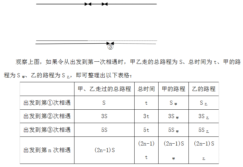 由上表可知,甲乙走過的總路程、總時間、甲的路程、乙的路程存在的比例關(guān)系均為1:3:5:……:(2n-1)。知道這個比例關(guān)系,就可以解決直線異地多次相遇的所有題目。