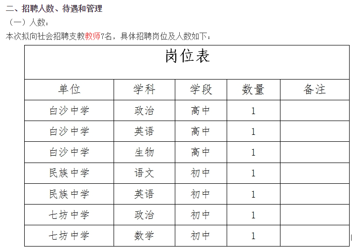 (報考人員如實(shí)提交相關(guān)信息和材料,凡本人填寫信息不真實(shí)、不完整或者填寫錯誤的,責(zé)任自負(fù);弄虛作假的,一經(jīng)查實(shí)即取消考試資格或者聘用資格)請發(fā)送以上材料的掃描件或者照片至郵箱945227729@qq.com,標(biāo)題格式為“姓名+學(xué)校+應(yīng)聘崗位”,如“張三+白沙中學(xué)+初中英語”。