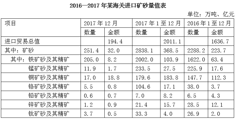 99. 2017年全年,該海關(guān)總計進口鐵、錳、鉻、鉛、鋅、鈦之外的礦砂及其精礦約多少億元?