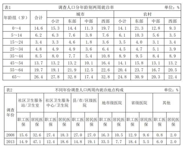 兩周就診率被定義為每百人中兩周內(nèi)因病或身體不適尋求各級醫(yī)療機構(gòu)治療服務的人次數(shù)。第五次國家衛(wèi)生服務調(diào)查結(jié)果顯示,調(diào)查地區(qū)居民兩周就診率為13%,其中城市地區(qū)為13.3%,農(nóng)村地區(qū)為12.8%。城市地區(qū),東部、中部、西部兩周就診率分別為15.4%、8.8%、15.8%;農(nóng)村地區(qū),東部、中部、西部兩周就診率分別為16.1%、11.4%、11%。