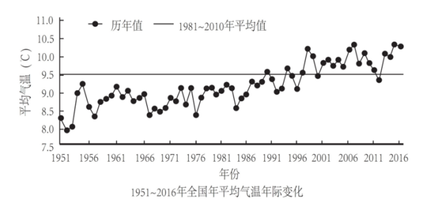 B.1951~2016年,全國年均氣溫總體呈上升趨勢