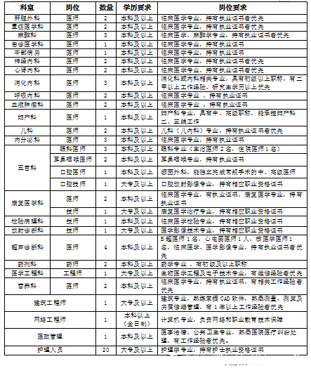 2020年招聘需求共計(jì)70名,臨床醫(yī)師36名,醫(yī)學(xué)影像醫(yī)師4名、技師2名,臨床藥師2名,康復(fù)治療技師1名,臨床醫(yī)學(xué)檢驗(yàn)技師1名,護(hù)理人員20名,工程師3名,醫(yī)政管理1名。